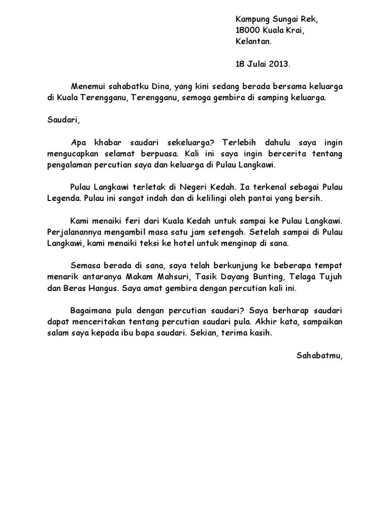 Simple english essays / contoh karangan bahasa inggeris mudah. Contoh karangan bi bercuti di pulau perhentian. Tingkatan / form 1, 2, 3. Contoh karangan bahasa inggeris tentang percutian. Senarai tempat menarik di melaka untuk mereka yang sedang merancang percutian. Contoh karangan upsr percutian di pulau langkawi pada cuti persekolahan minggu . Destinasi percutian di malaysia yang tidak asing lagi, iaitu pulau langkawi menawarkan pelbagai aktiviti menarik untuk pelancong lakukan. Tahun / year 1, 2, 3, 4, 5, 6. Contoh karangan bahasa inggeris tentang percutian. Di bawah ini adalah contoh skrip presentasi oral bahasa inggris tentang makanan beserta dengan terjemahannya. Tips destinasi terbaik di negeri melaka beserta harga tiket, . Karangan melancong bersama keluarga karangan bercuti di cameron highland bersama. Pulau langkawi merupakan pusat perlancongan yang terletak di negeri kedah, iaitu di utara semenanjung malaysia. Kali ini tentang penginapan semasa percutian keluarga di holiday inn batu ferringhi . Berikut 5 contoh bentuk karangan dalam bahasa inggris.